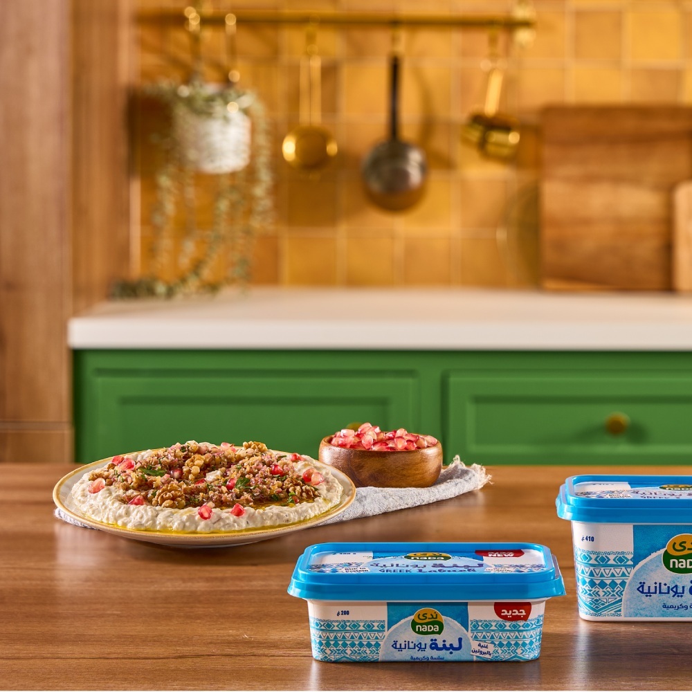 4. Add the labneh and mix, then transfer the mixture to a wide serving dish and spread it in circular motions using the back of a spoon.